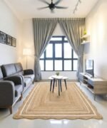 Material & Contrast: Made from golden jute, the rug adds essential warmth to cool-toned rooms. The thin white accent line provides a sharp contrast that ties in beautifully with white walls or ceilings, as seen in the image.